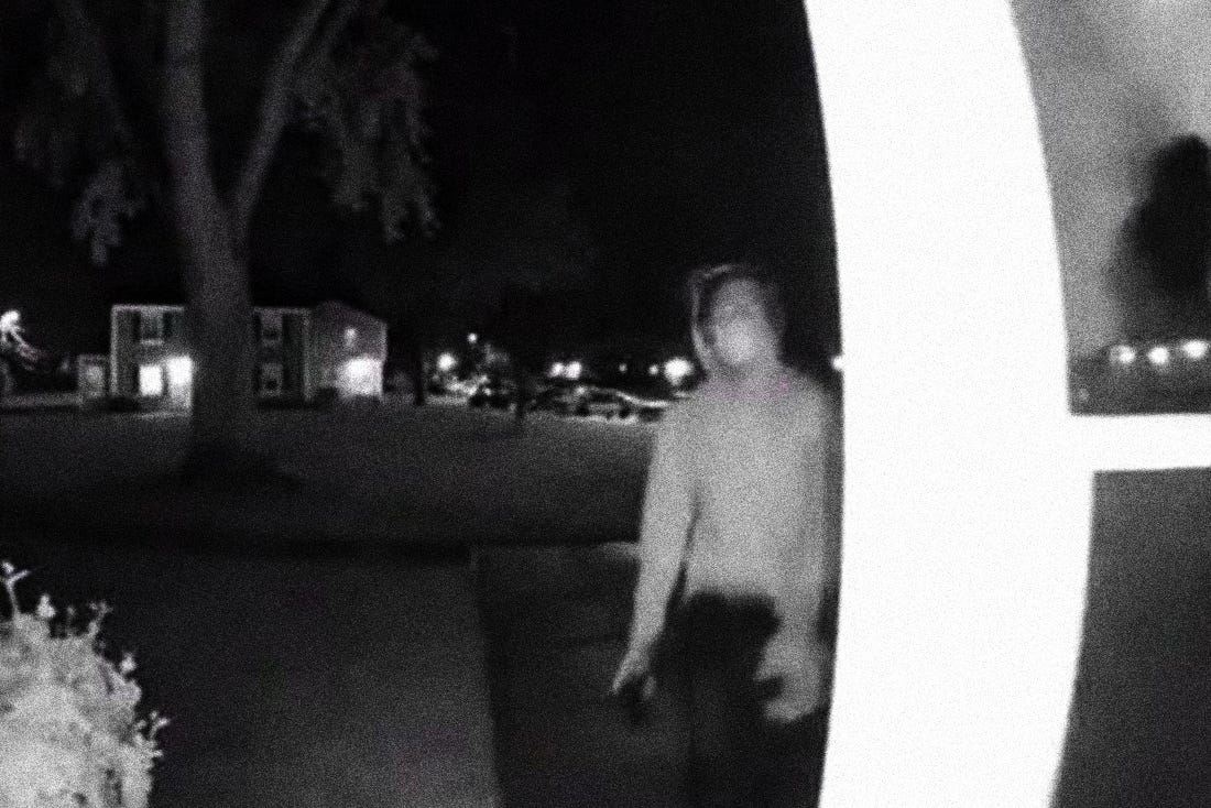 I move my cursor further down the video track and click into a position a few minutes ahead. The sun has completely set and the thin man is now clumsily maneuvering the camcorder in front of an affluent family home. He curiously whispers to himself as he brushes past a lavish garden and edges towards a dim light on the porch. He creeps down the left side of the home and peers inside a French glass door bathed in a warm glow. The camera autofocuses on a a little boy and girl watching TV cross-legged with their backs to the glass door. They are within an arm’s length of each other. A middle-aged woman walks into the frame, unaware she and the children are being watched and recorded. The thin man mumbles to himself and lets out an exhilarating snicker. He places the camcorder on the ledge of the porch, takes a few steps back into the darkness of the front yard and rummages through his jam-packed backpack.